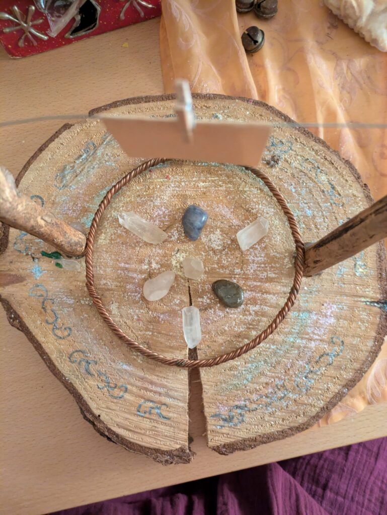 Auf einem Metalldraht, der zwischen auf einer Holzscheibe befestigten Stäben gespannt wird, soll der Zettel mit einem Wunsch gehängt werden. Ins Mondlicht gestellt, wird dieser dann aktiviert. (Bei manchen Anleitungen wird der Wunsch auch verbrannt)