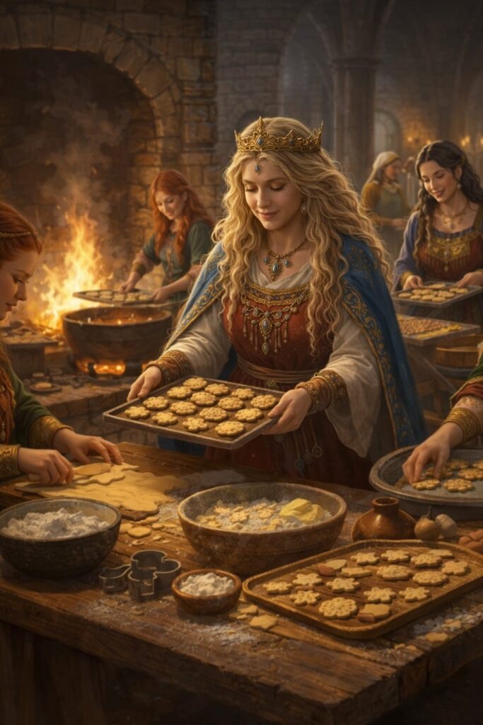 So wie ich es interpretiere ist es vielleicht Frigg, die mit ihren Dienerinnen am Herdfeuer in der Burgküche steht und Baumkuchen backt 😉